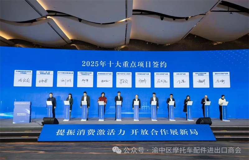 会上,商会法定代表人冯仁发作为摩配行业外贸代表,与渝中区签约落地2025年十大重点项目,为摩配外贸促消费、扩开放蓄势,助力夺取 “全年红” 。